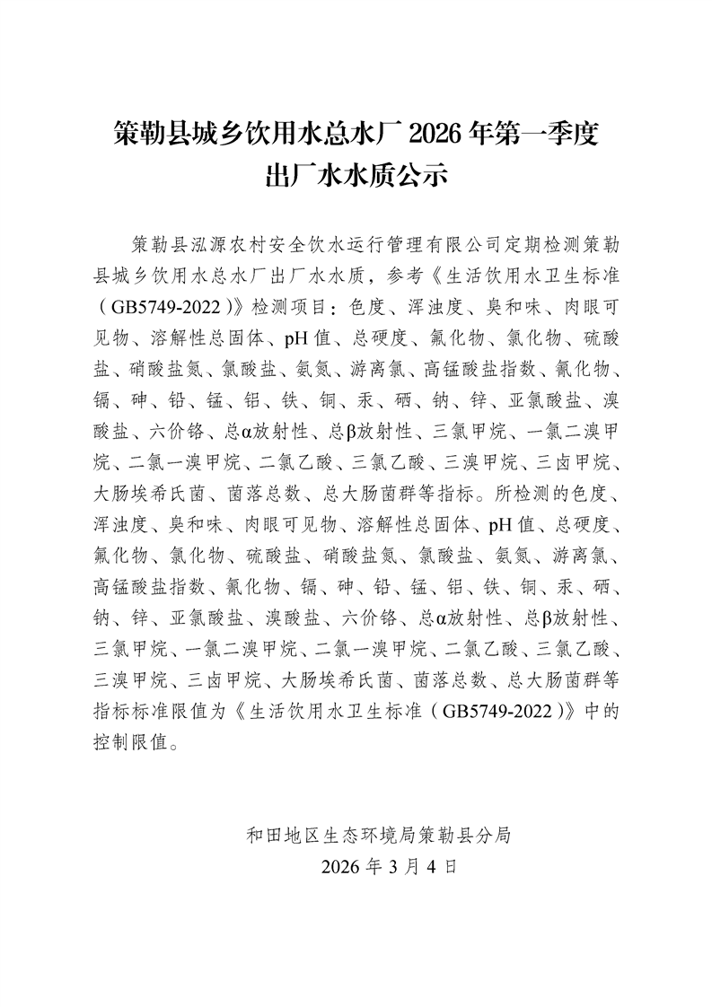 策勒县城乡饮用水总水厂2026年第一季度出厂水水质公示