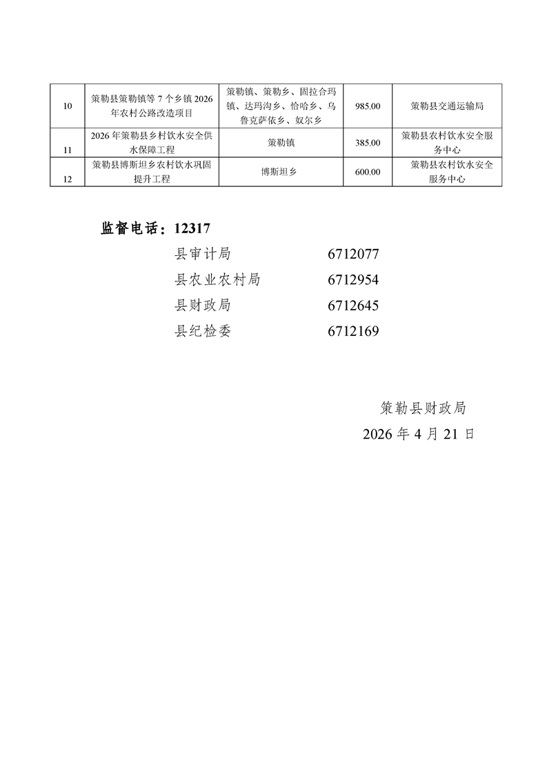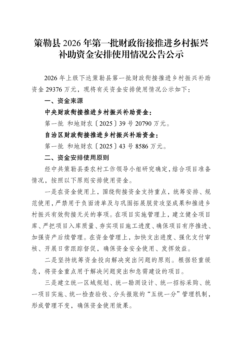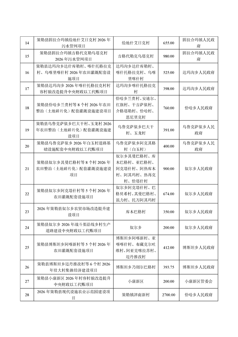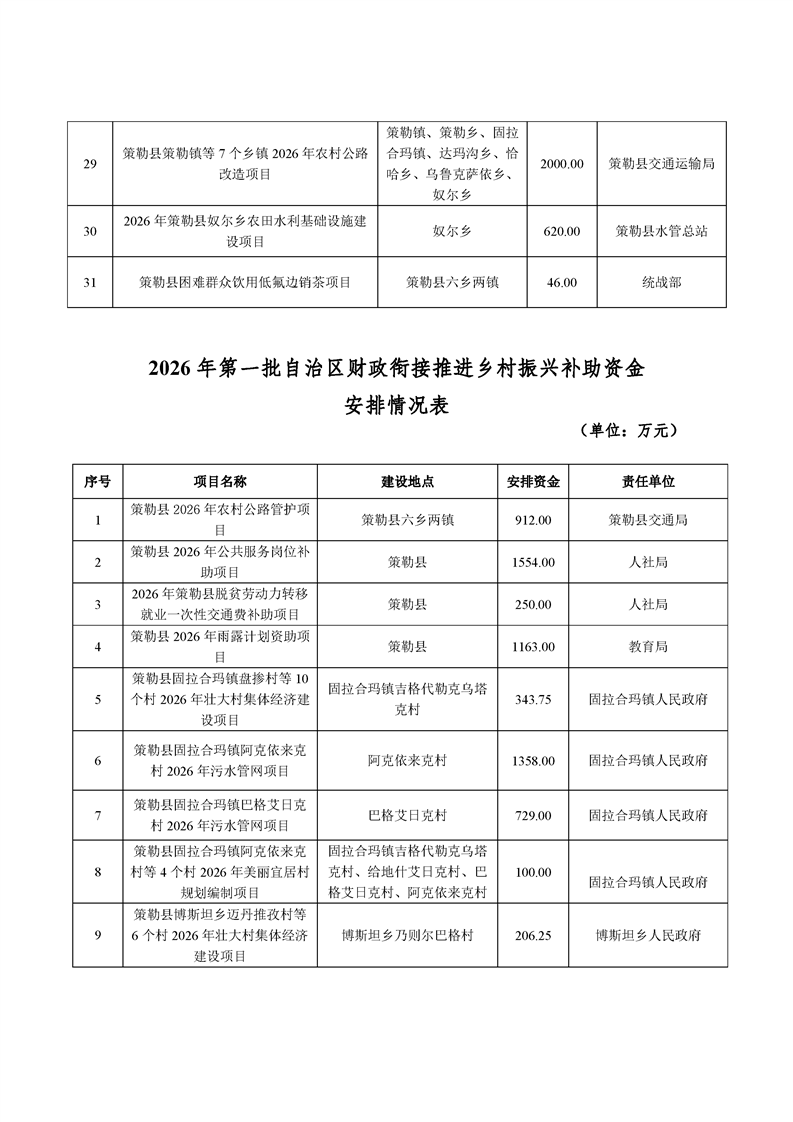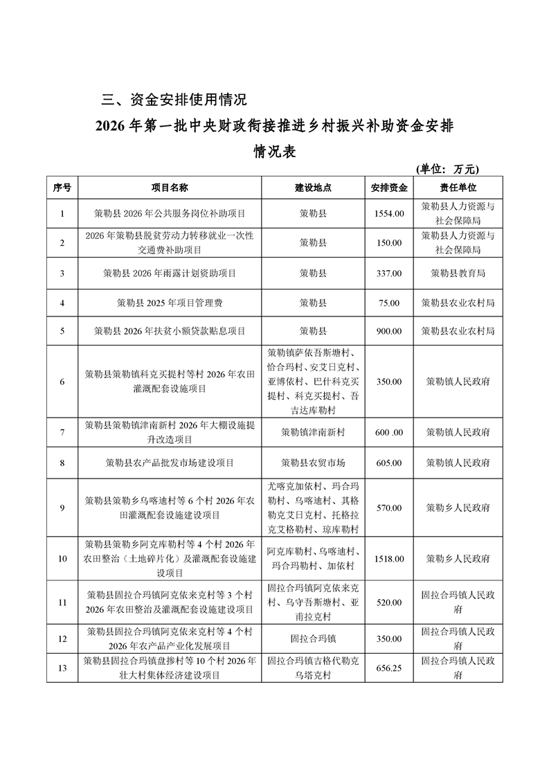 策勒县2026年第一批财政衔接推进乡村振兴补助资金
