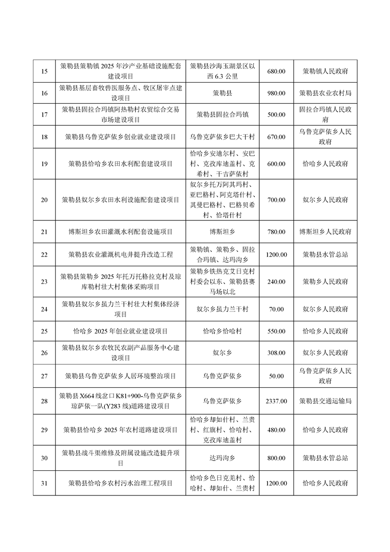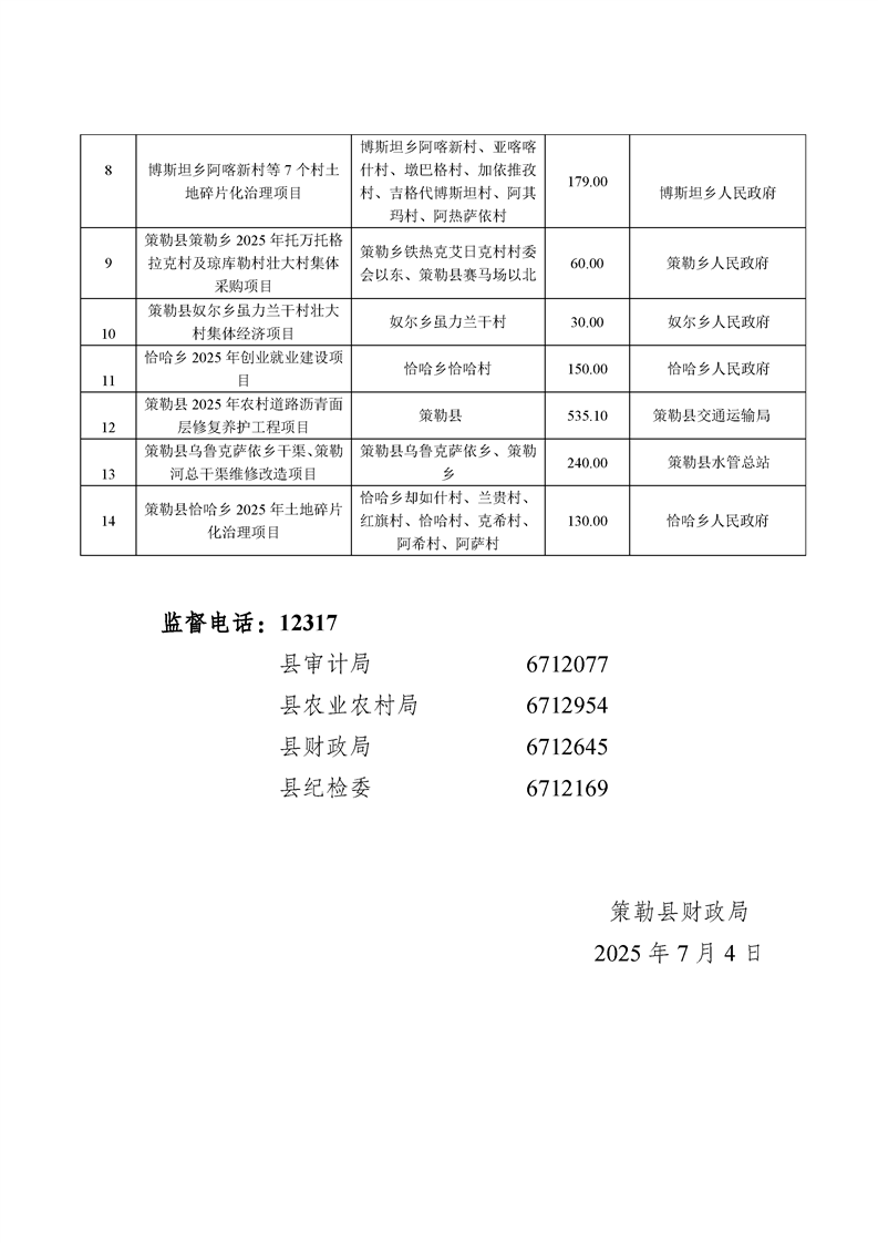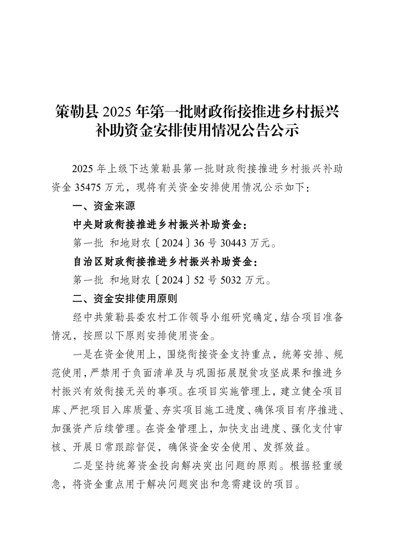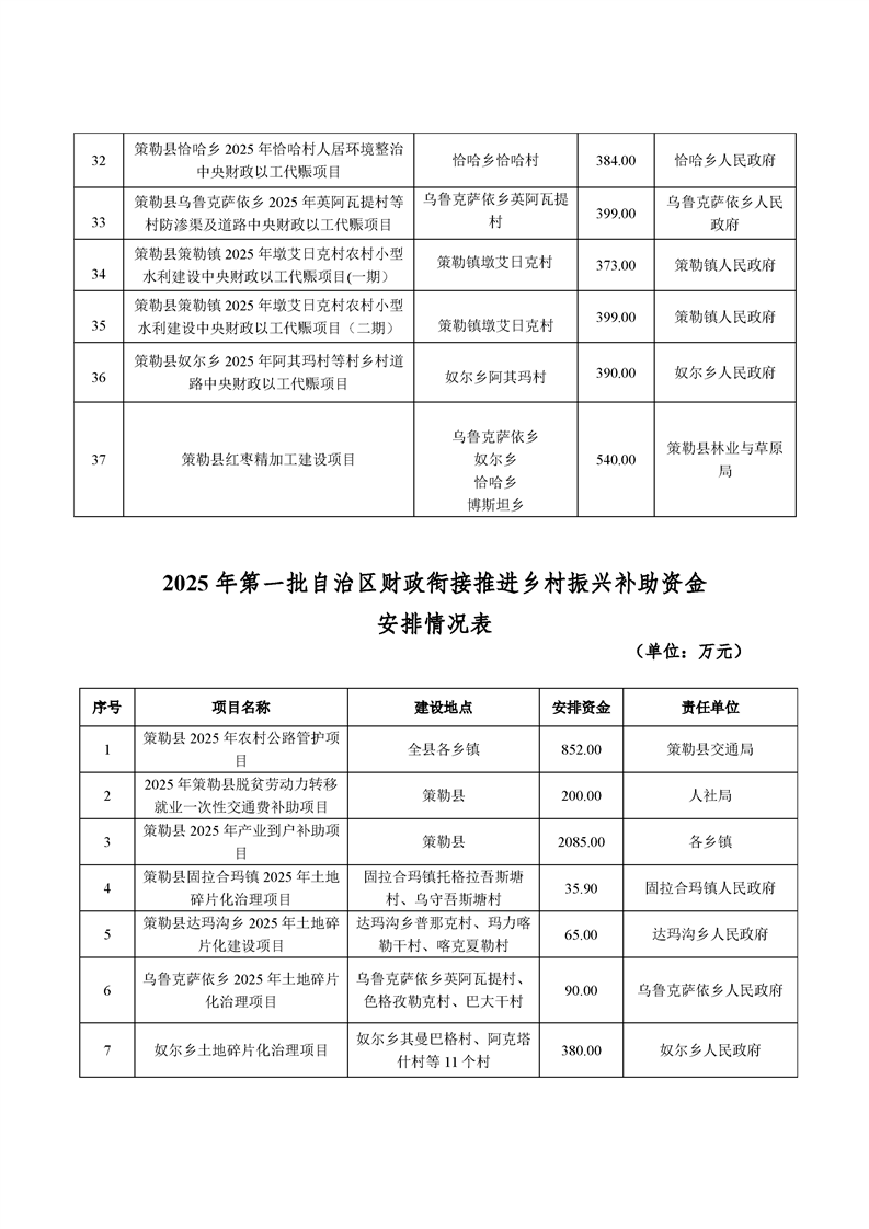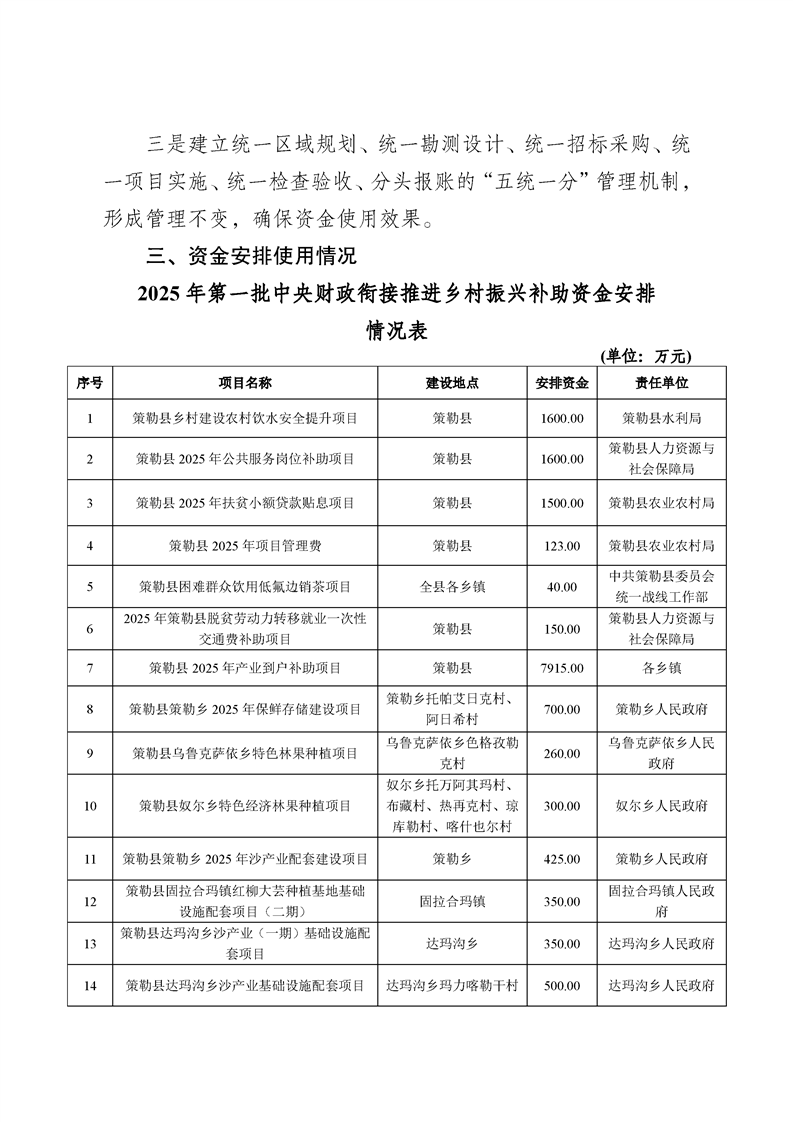 策勒县2025年第一批财政衔接推进乡村振兴补助资金安排使用情况公告公示