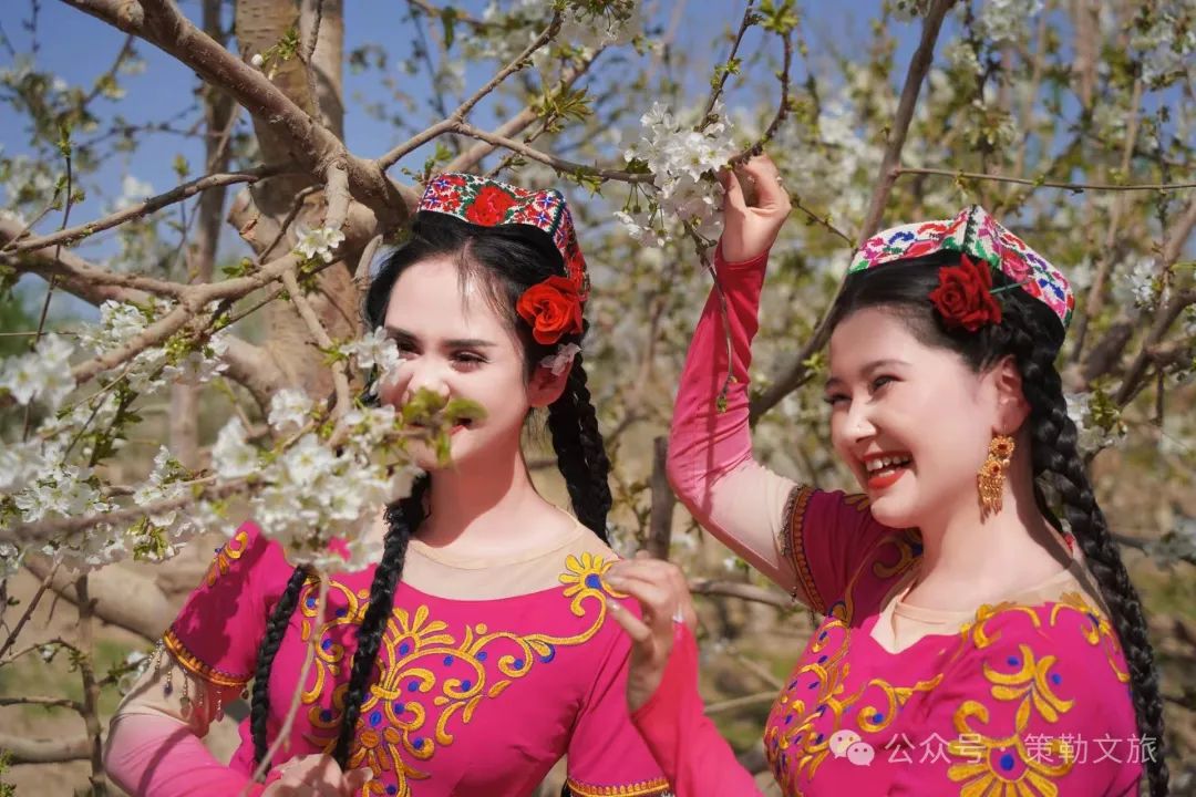 新疆美女们身着绚丽的民族服饰,漫步在花海中,她们的美丽与娇嫩的花朵相互映衬,如同春天里最动人的画卷。她们在花间游玩嬉戏,花朵的艳丽与美人的风情万种相互映衬,构成了一幅独特而迷人的风景。