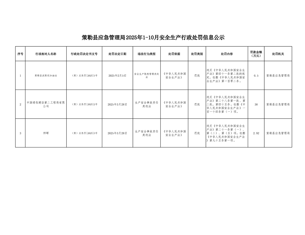 策勒县应急管理局2025年1-10月安全生产行政处罚信息公示