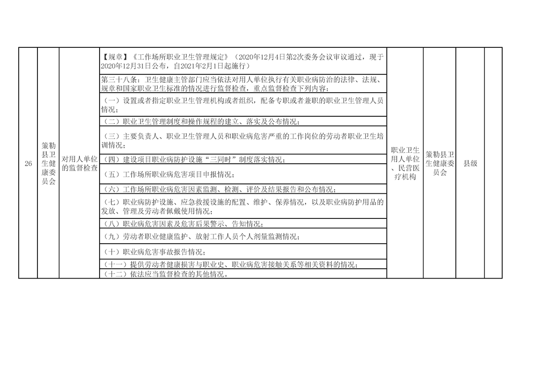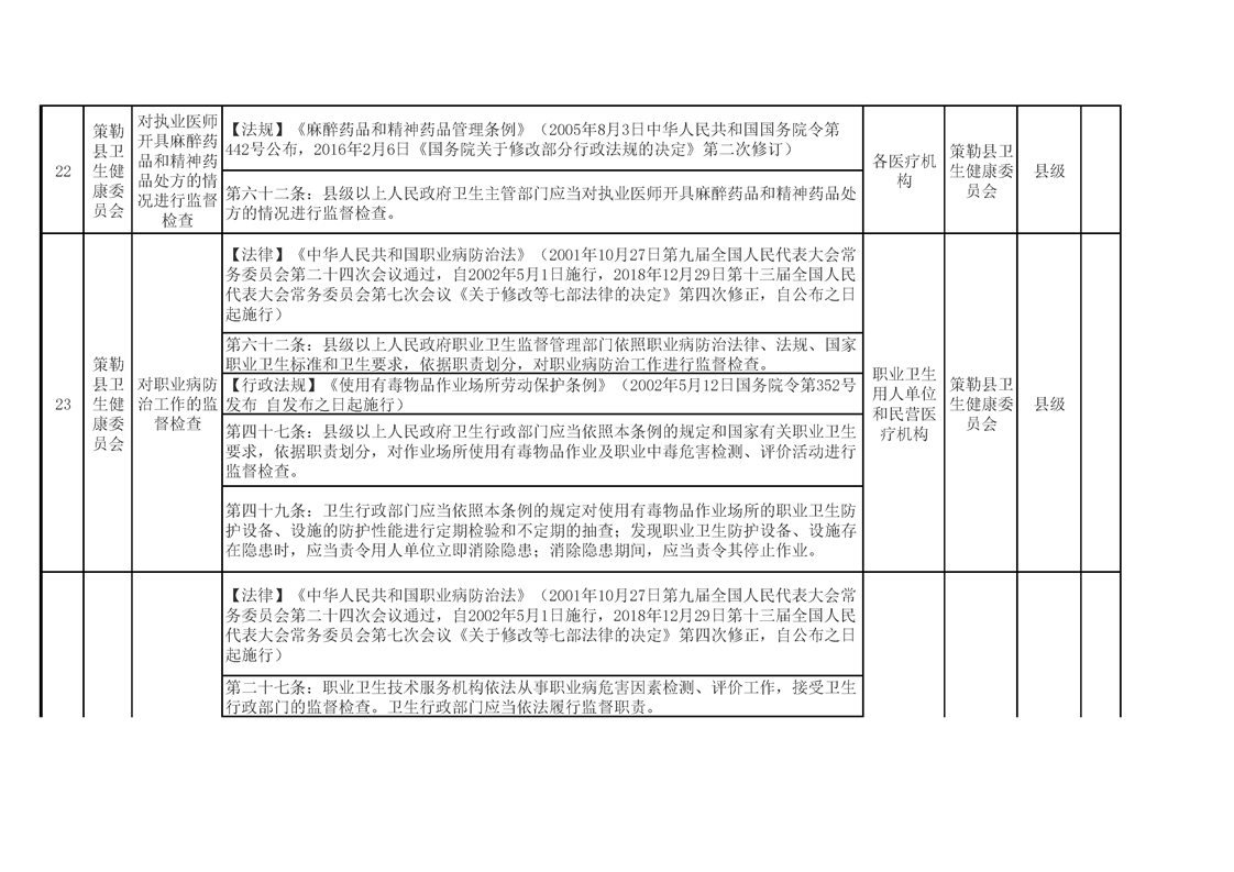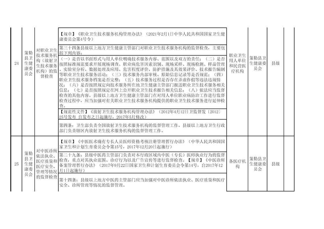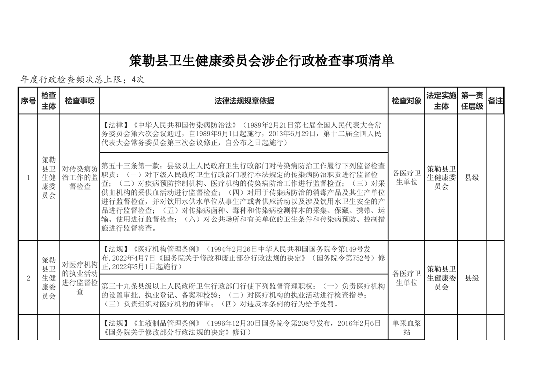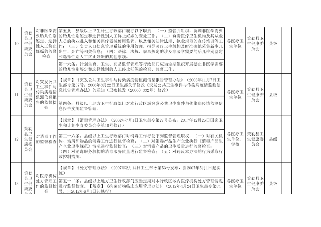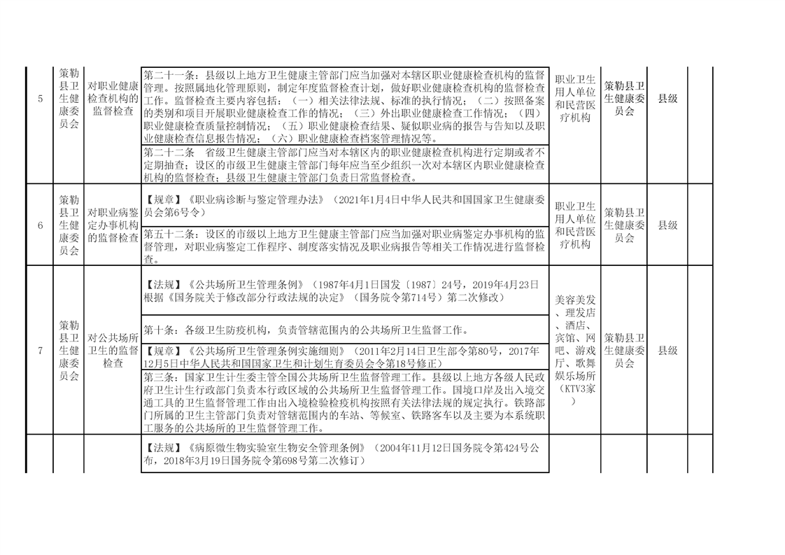 策勒县卫生健康委员会涉企行政检查事项清单