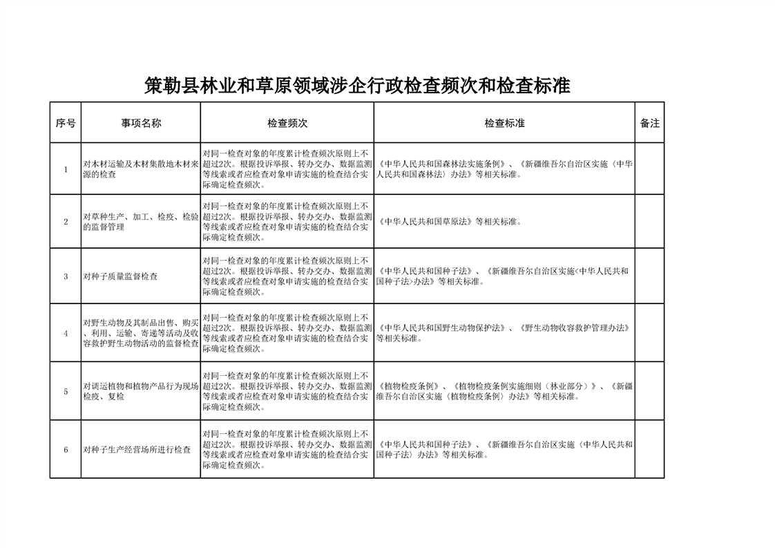 策勒县林业和草原领域涉企行政检查频次和检查标准